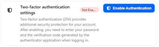 Two-Factor Authentication adds a second verification factor during login. Once enabled, logging in requires both your password and a time-based one-time password (TOTP).