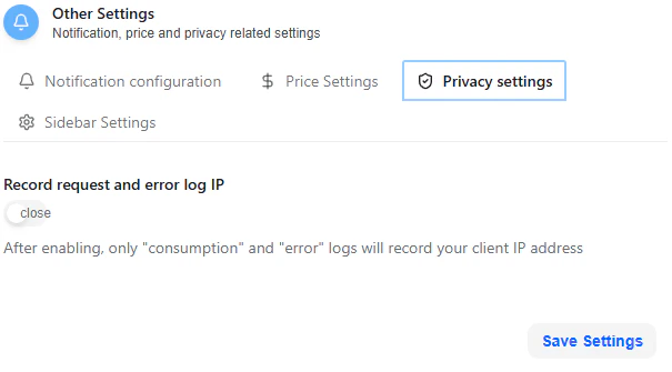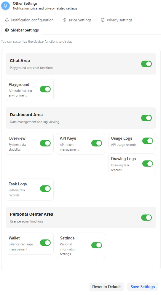 - Other Settings: operational, pricing, privacy, and UI controls