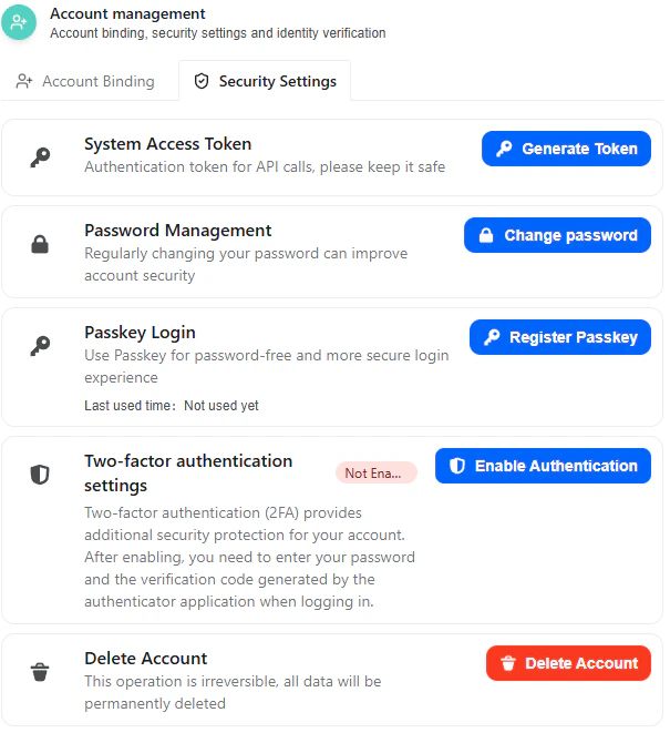 The Account Management section governs authentication credentials and account-level security.Account Binding