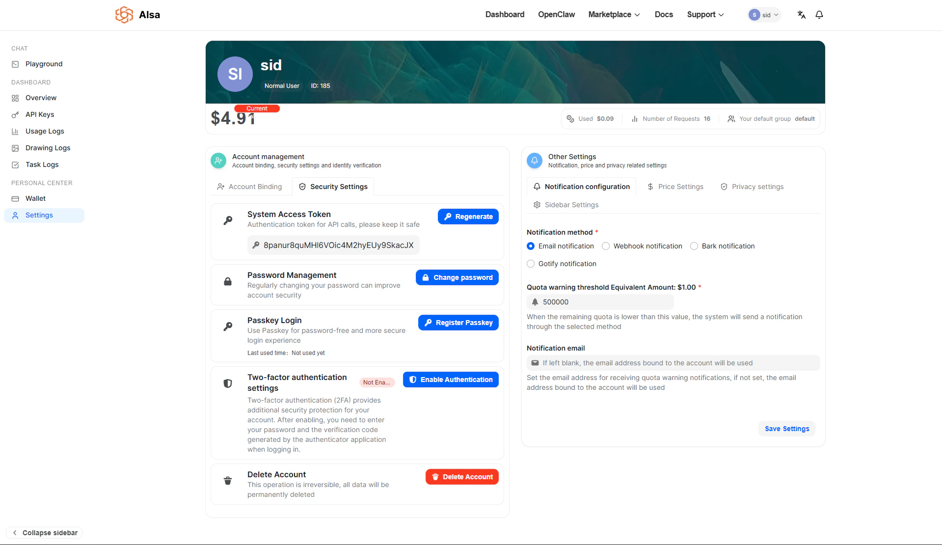 You can define a quota warning threshold expressed as an equivalent USD amount. For example:- If set to $1.00, the system sends a notification when remaining quota falls below that value.