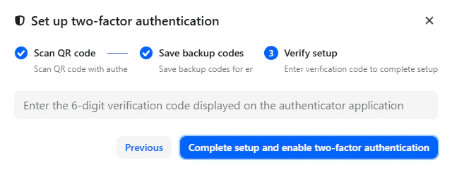 - Click Complete setup and enable two-factor authentication.