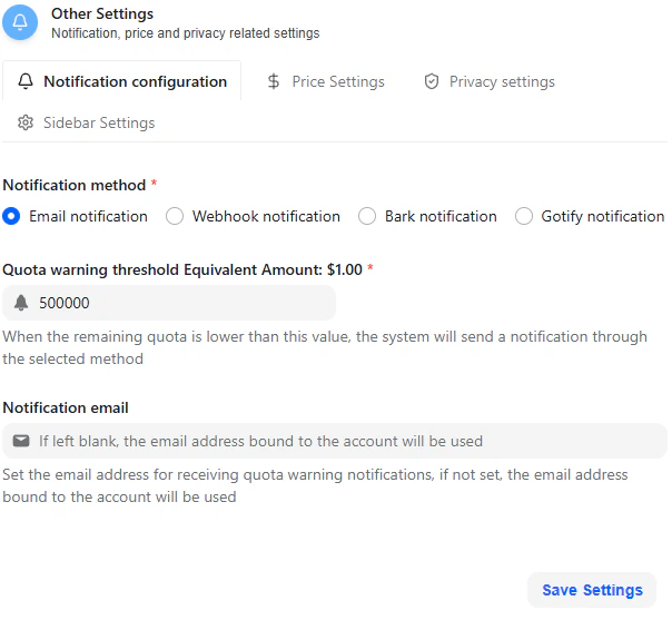 The Other Settings section governs operational controls, cost safeguards, and dashboard behavior.Notification Configuration