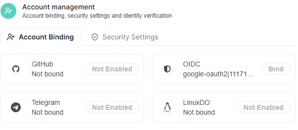 The Account Binding panel allows external identity providers (such as GitHub or OIDC providers) to be linked to your account for federated authentication.